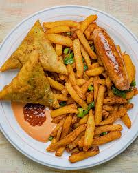 300 g of Chicken, 150 g of sausage, 200g pork filet, 3 pcs of samosas and chips