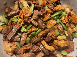500g beef cubes, 1 big onion (chopped in cube), 3 colors of green peppers, open flame then grilled with a little oil and BBQ spice, basting sauce brushed over peri, served with lemon wedge